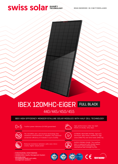 Levering en plaatsing van 10 stuks zonnepanelen fullblack Swiss Solar 450 watt piek (TIER1) 113,4x190,3cm.